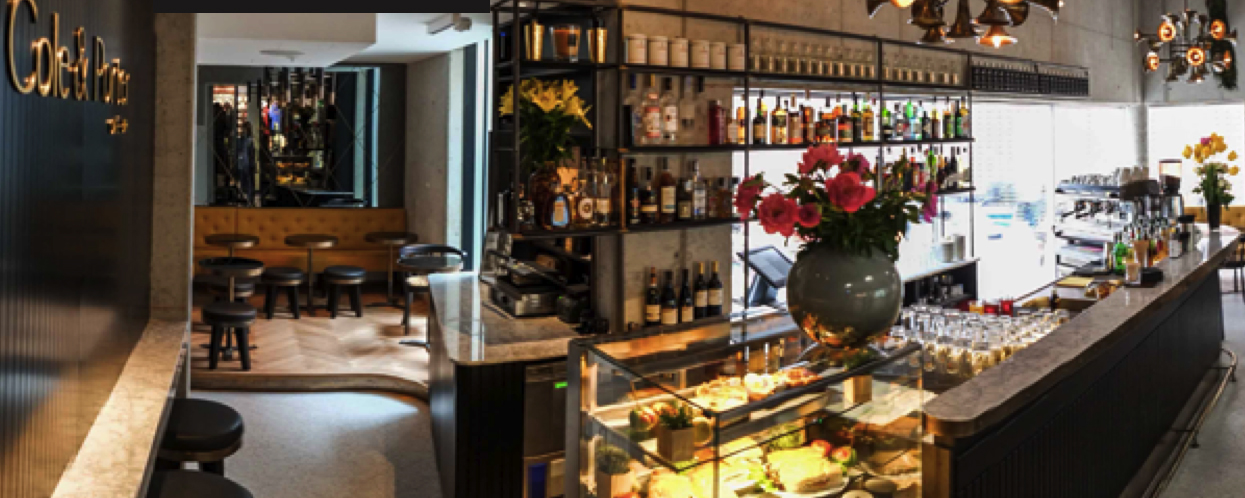 The kitchen is open all day, every day. Visitors are especially fond of the Thai curry, be it vegetarian or with chicken or salmon. The menu also includes classic dishes such as Caesar salad and fresh pasta as well as toasted sandwiches for a light snack. The spacious, partially covered indoor terrace is the ideal spot for a break away from the chaos of the city centre. Glass elements that can be opened make guests outside feel that they are standing right next to the bar. This is very much at the centre of proceedings with an excellent selection of spirits as well as some very fine wines served at an open counter.