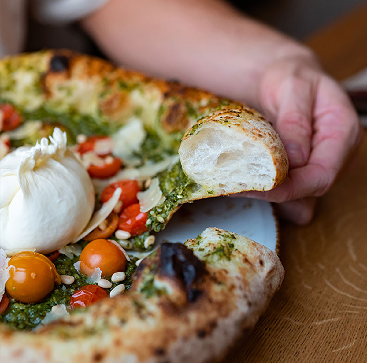 Für den besonderen Pizzateig verwenden wir „00“ Mehl aus der Region Neapels, etwas Hefe, Meersalz und Wasser. Dieser ruht dann bis zu 72 h bis er seinen besonderen Geschmack erhält.